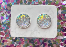 Complimenting earrings are pastel rainbow 12mm studs.