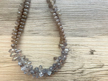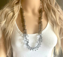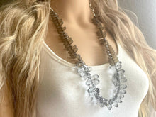 A great statement piece! Long single strand of acrylic beads in complimenting colors - translucent gray and smoke gray.