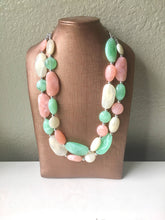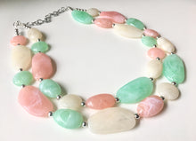 Love this color combination! 3 colors in 3 sizes of gem style acrylic beads. Each bead is unique with a creamy, swirled look. Beads range in size from 25mm to 45mm. Each bead is spaced with a metallic silver bead for a chic, high end boutique style finish.