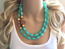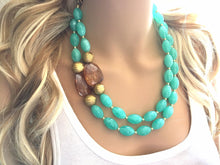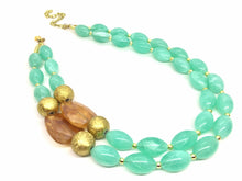 A great statement piece! Two layers of Mint green acrylic beads that and a small color block of gold and hot cocoa beads.