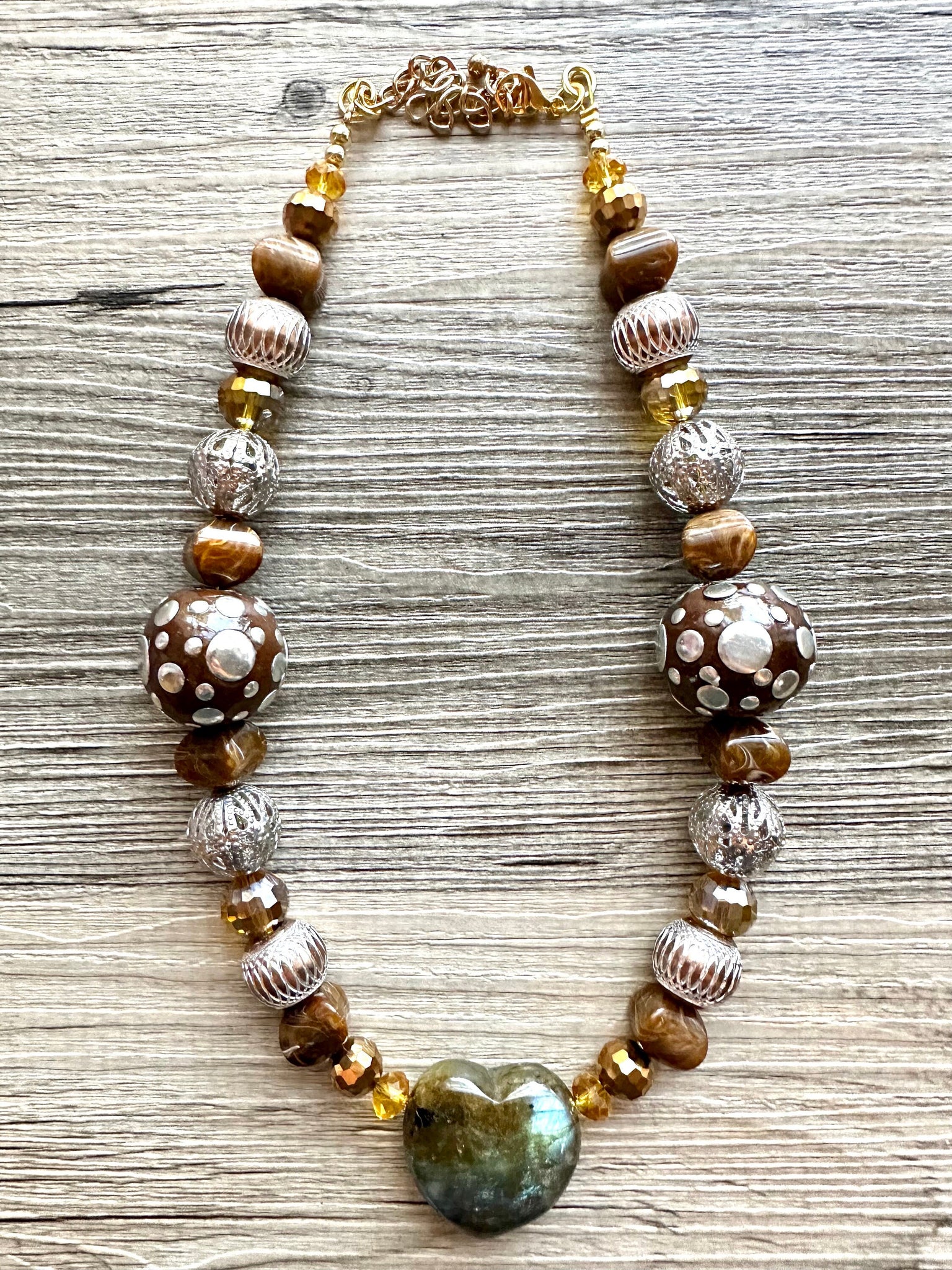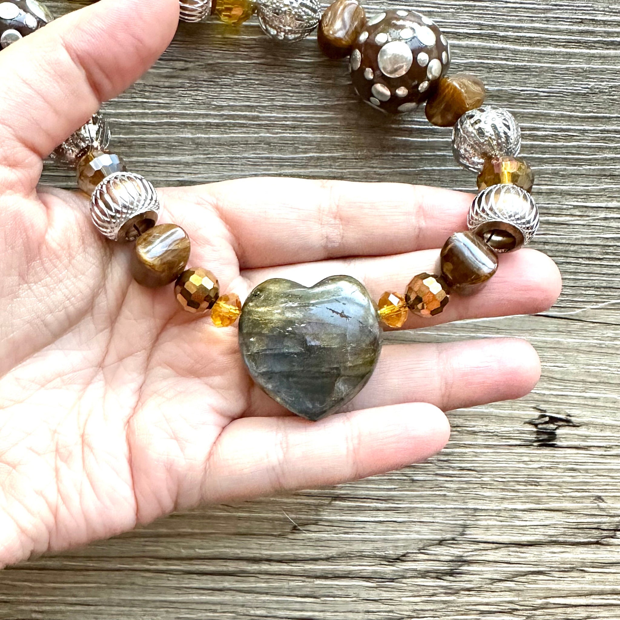We love this stunning piece that has a natural labradorite as it’s focal point. It is 16” plus a 4” extender chain.