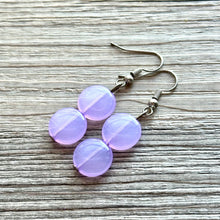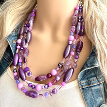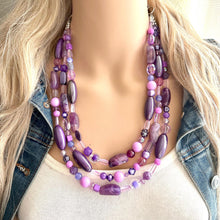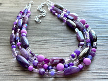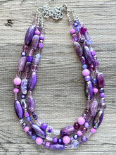 3 layer striking statement necklace, made with a medley of acrylic and glass purple beads in various sizes.