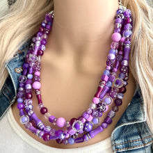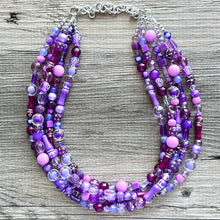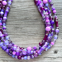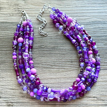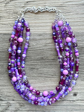 5 layer striking statement necklace, made with a medley of acrylic and glass purple beads in various sizes.