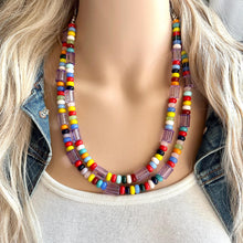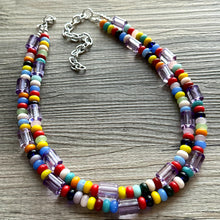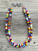 Multi color beaded necklace in rainbow colors. Silver finishing. Made with glass and resin beads.