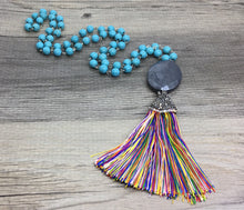 A great statement piece! Long necklace that begins with turquoise beads that have been assembled each by hand into a 30” long strand. We them attached a creamy, gray oval bead atop a silk rainbow and rhinestone tassel. Lots of glamour!!