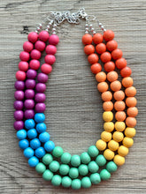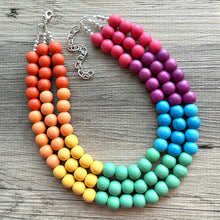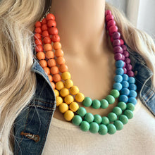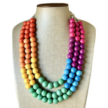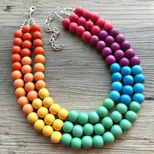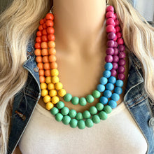 Rainbow Wood Bubble Statement, wooden jewelry, silver chain thick bib chunky necklace, 3 strand red orange yellow green blue purple pink