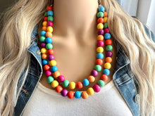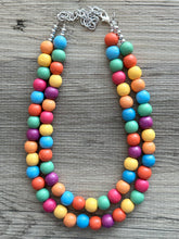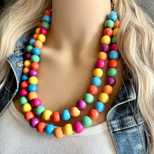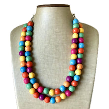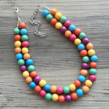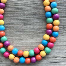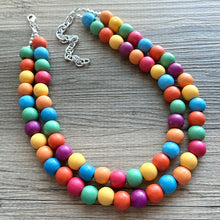 Rainbow Wood Confetti Statement, wooden jewelry, silver chain thick bib chunky necklace, 2 strand red orange yellow green blue purple pink