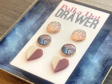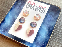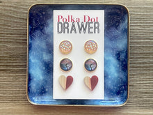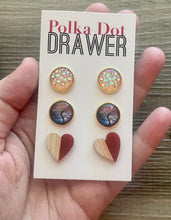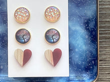 Set of 3 earrings, 12mm earrings, sparkle earrings, stud earrings circle, stocking stuffer wood resin heart Cabochon silver and gold pierced