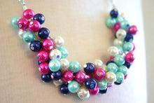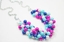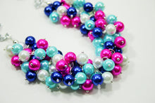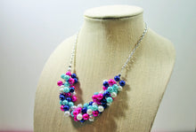 Pretty acrylic pearl cluster necklace adorned with shades of light & dark blue, pink, and white.