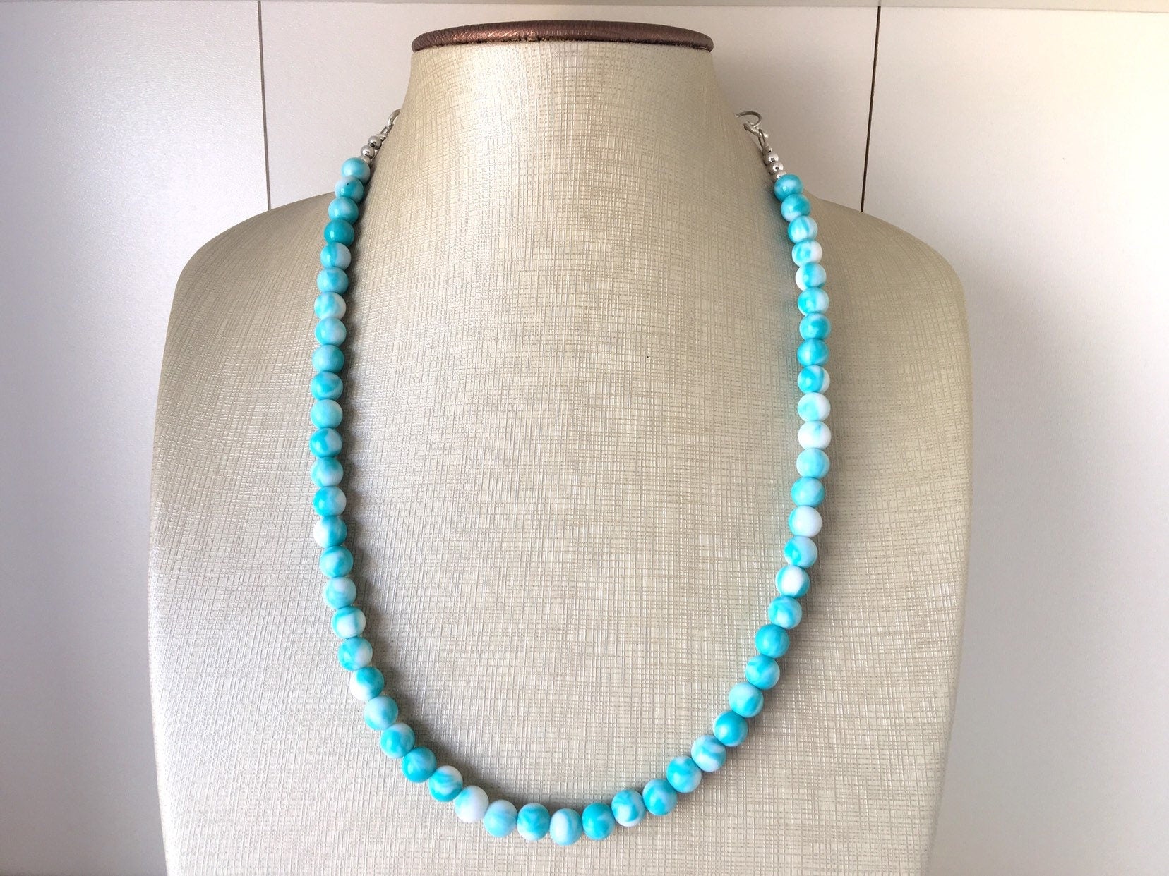 We love this teal blue + white necklace, made with acrylic beads. It is 16” plus a 4” extender chain.