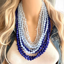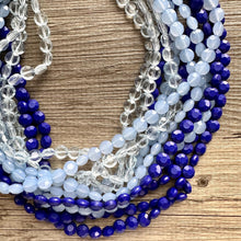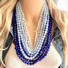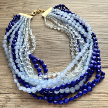 11 strands of lentil style beads in this unique light blue and royal blue color. Thousands of beads were put together to make this thick statement. Gold findings and extender chain.