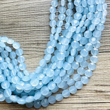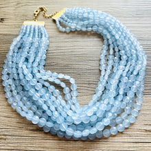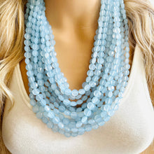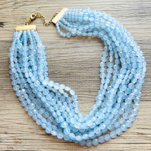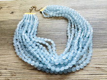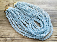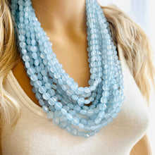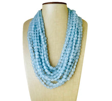 11 strands of lentil style beads in this unique light blue color. Thousands of beads were put together to make this thick statement. Gold findings and extender chain.