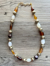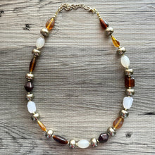 Beautiful resin & glass beads that have collided with a gold shiny linked chain.